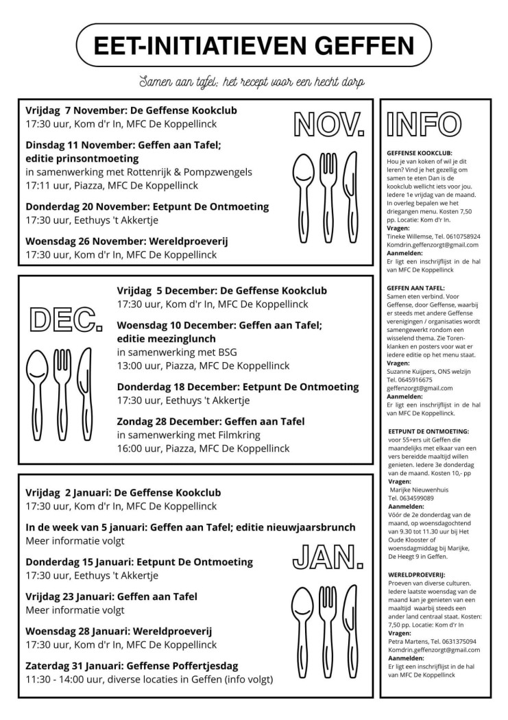 Geffen Zorgt is gestart met een geheel nieuwe serie eet- en ontmoetactiviteiten. Doel is om mensen elkaar te laten ontmoeten op een recreatieve manier. Hierbij is iedereen welkom. De activiteiten, een of twee keer per maand, worden gekoppeld aan een leuk thema samen met een Geffense Vereniging.