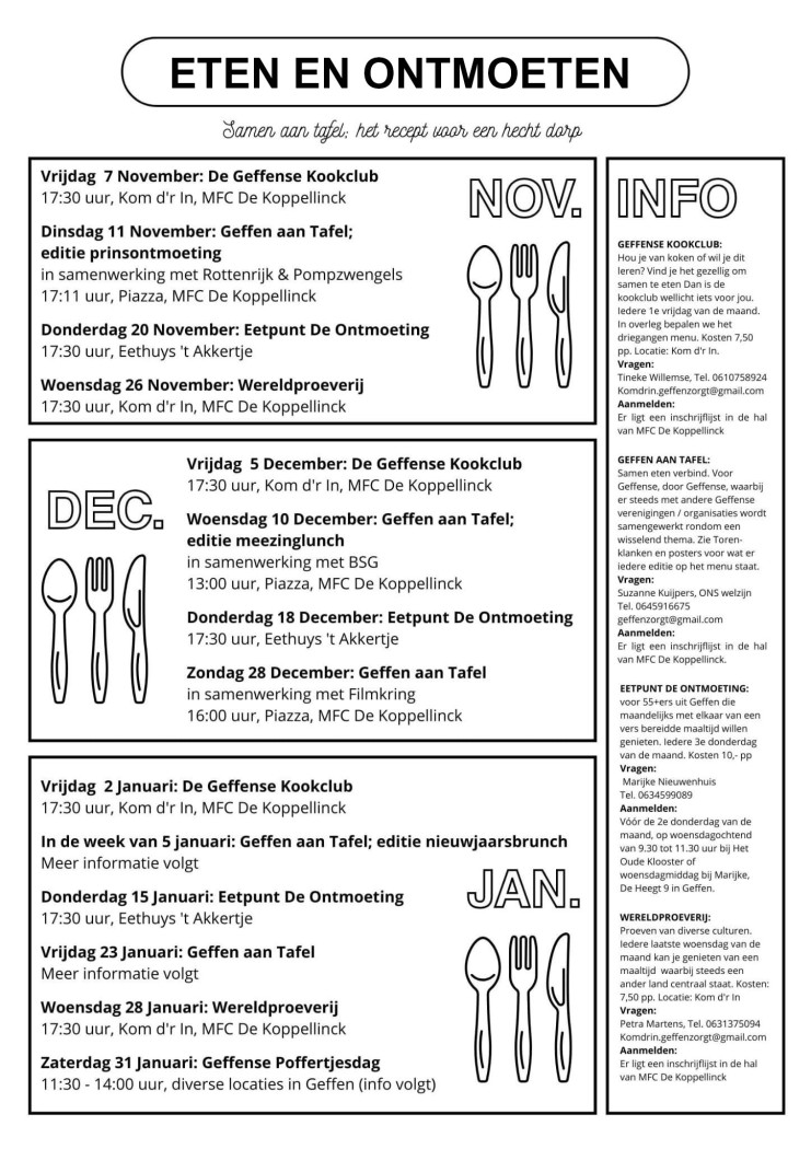 Geffen Zorgt is gestart met een geheel nieuwe serie eet- en ontmoetactiviteiten. Doel is om mensen elkaar te laten ontmoeten op een recreatieve manier. Hierbij is iedereen welkom. De activiteiten, een of twee keer per maand, worden gekoppeld aan een leuk thema samen met een Geffense Vereniging.